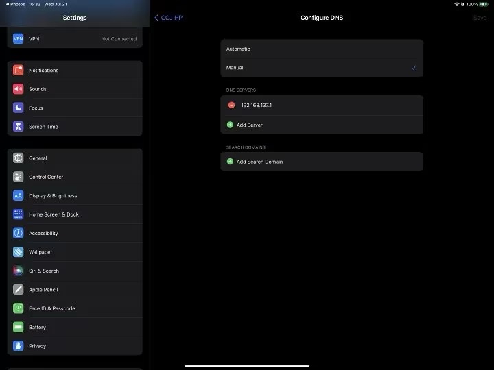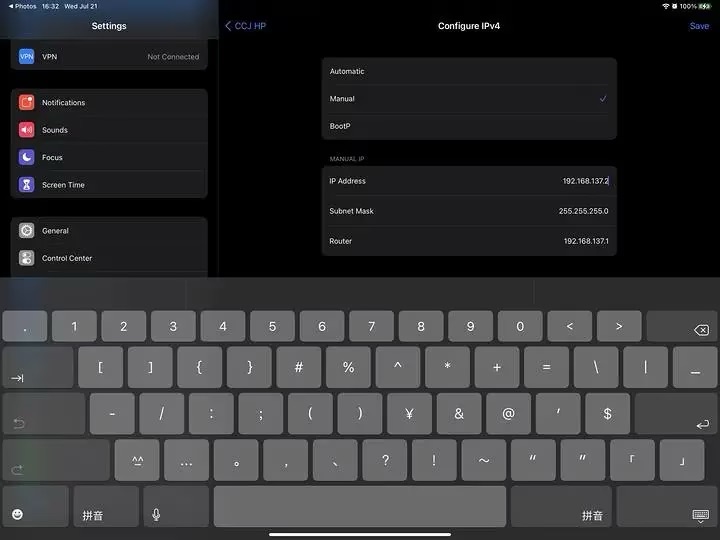 iOS打开设置,将自动改为手动,照抄当前连接信息,路由一般为IP地址最后一个数改为1,如果连接Windows的热点,还需改一下DNS与路由地址相同。