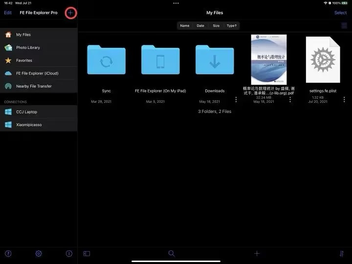 打开FE文件管理器,点击左上角的加号。