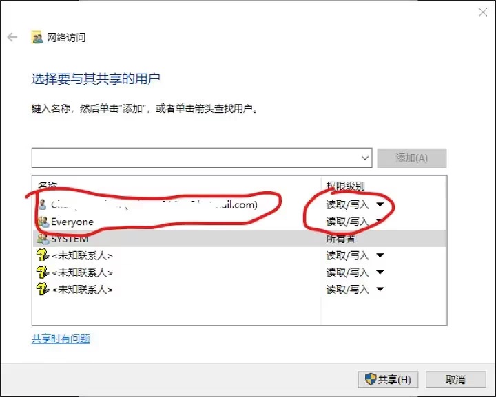 赋予你自己的账号读写权限,也可以顺便把Everyone的账号也设为“读取/写入”。