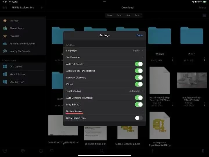 打开FE文件管理器,点击左下方的设置。选择内建服务器。