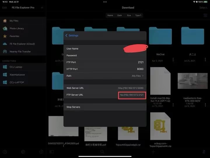 设置好登录的名称和密码,端口一般不要去改它。点击启动服务,记好FTP的地址。