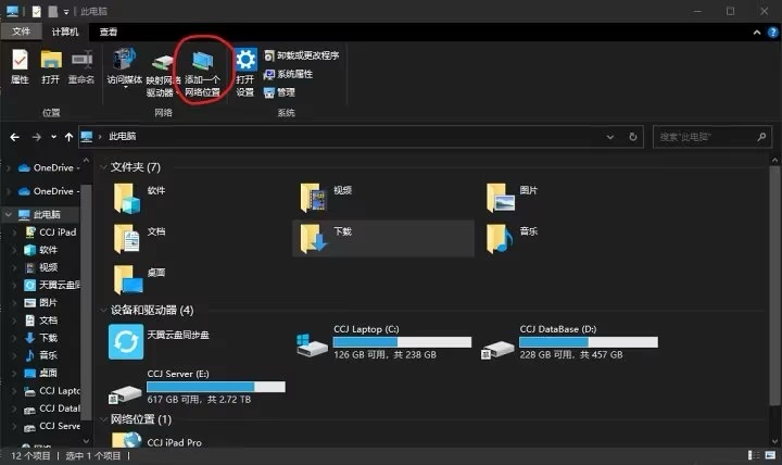 在Windows资源管理器中点击“添加一个网络位置”。