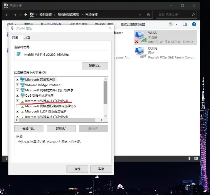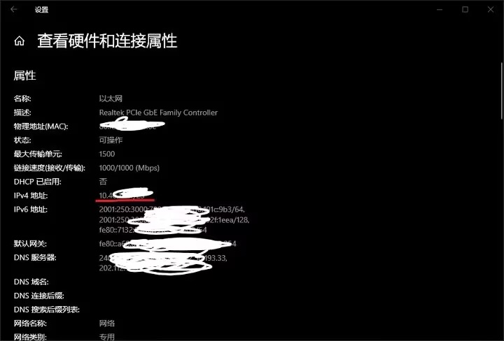 由于家用环境,路由分配的IP会变动,所以方便起见设置一下固定IP。 Windows打开网卡管理器,选择当前所用的网卡,进入ipv4协议设置,把当前的IP 网关 DNS照抄进去。