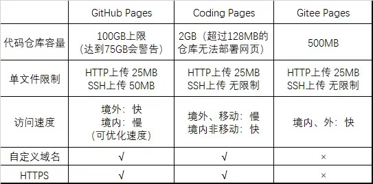 ②由于众所周知的原因,GitHub在国内的访问速度不理想(国外正常),关于速度优化的方法会在今后的进阶篇介绍。除了GitHub Pages,类似的服务还有腾讯云的Coding Pages和码云的Gitee Pages,下面的表格是三项服务的对比,从中也可看出我选择GitHub Pages的原因。