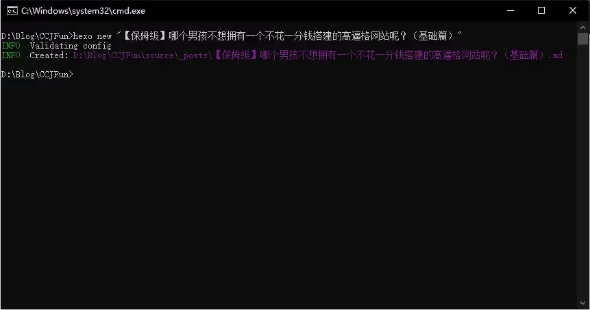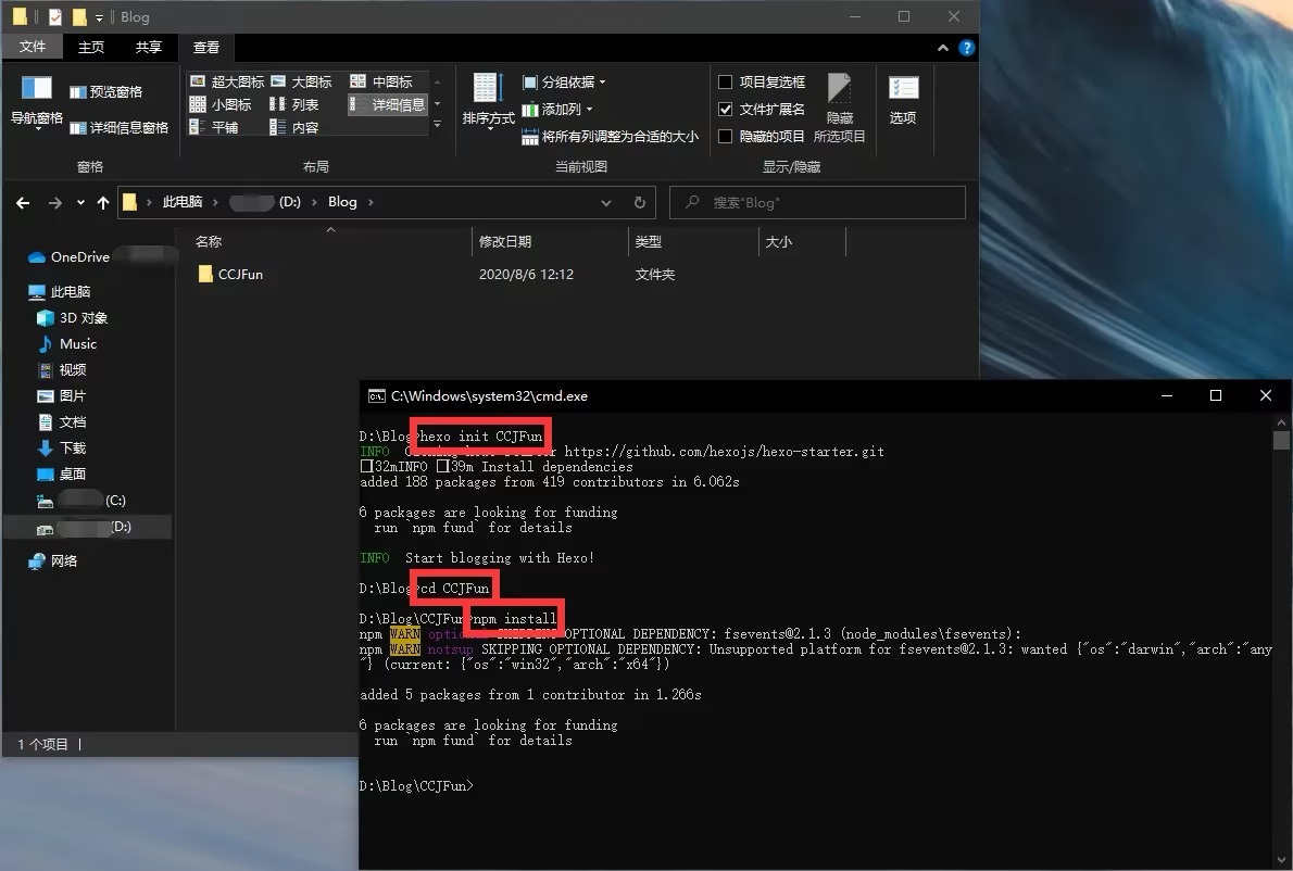 ②在你想要存放博客文件夹的位置打开终端,依次执行红框中的命令(请把CCJFun替换为你自定义的名称)。