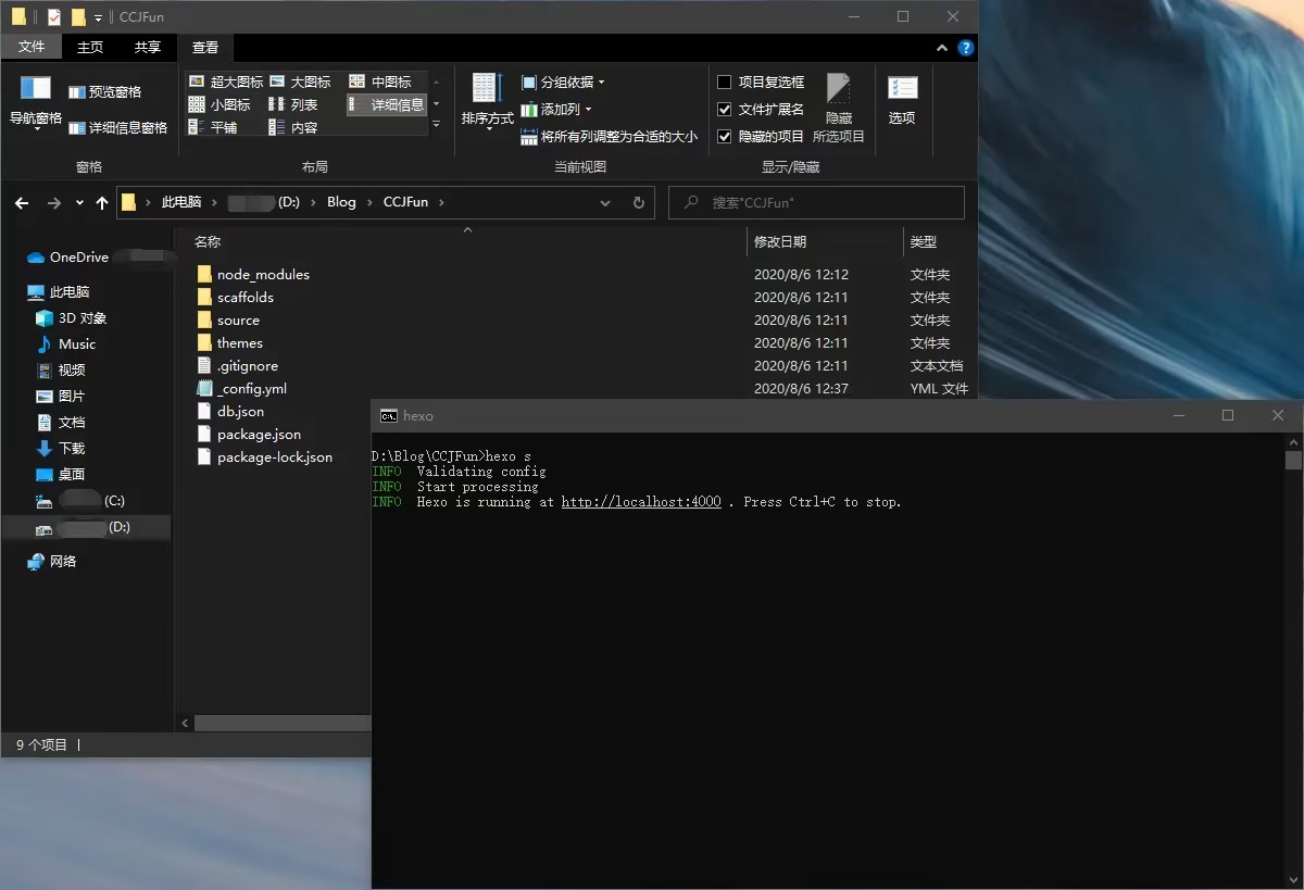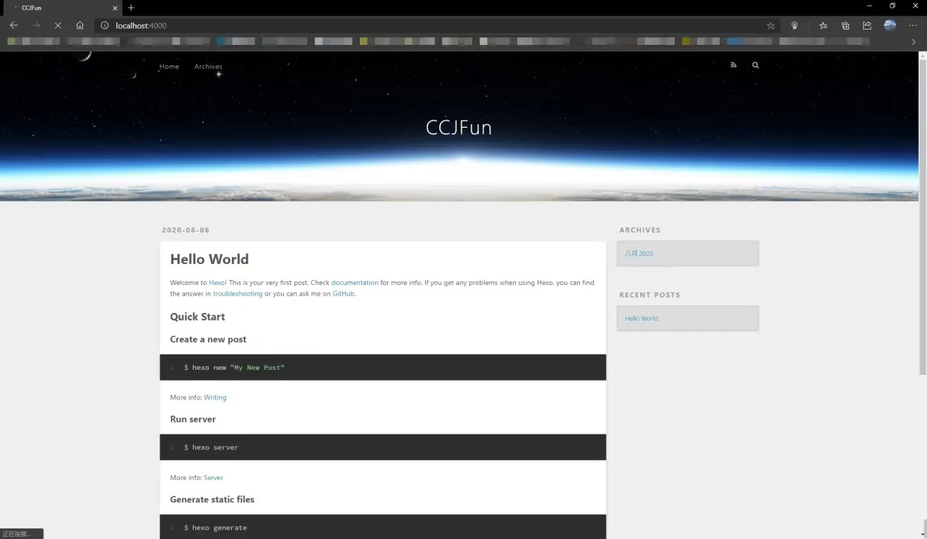 ⑤在博客文件夹根目录打开终端,执行hexo s,在浏览器打开http://localhost:4000 看看网站效果。