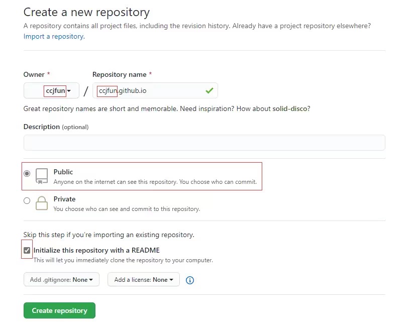 ②注意,仓库名称为owner.github.io,GitHub分配给这个仓库的网址才是一个纯域名。仓库要公开,为了调试方便勾选创建README。