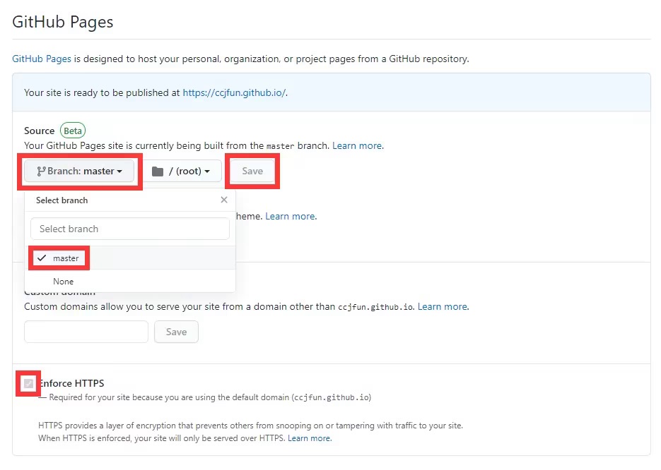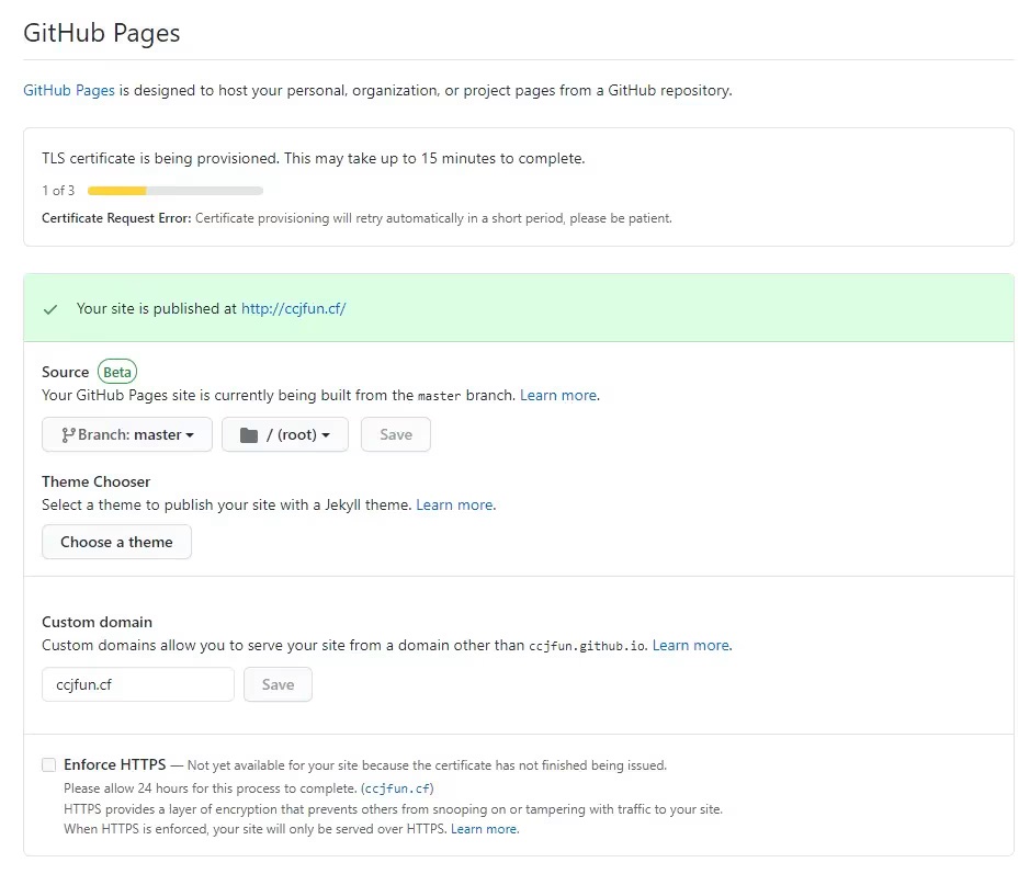 ⑧进入GitHub仓库的Pages设置查看是否更改成功。(HTTPS在更改自定义域名后需要时间生效)