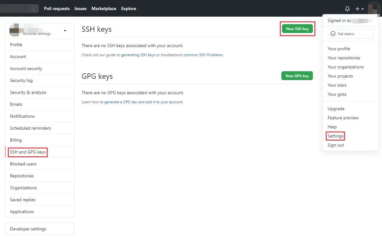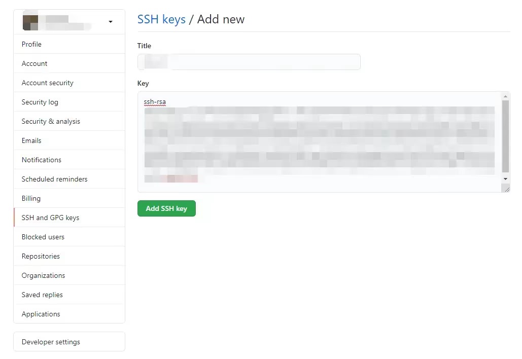⑦打开GitHub个人设置,进入SSH Key设置,点击New SSH key。粘贴密钥后确认。
