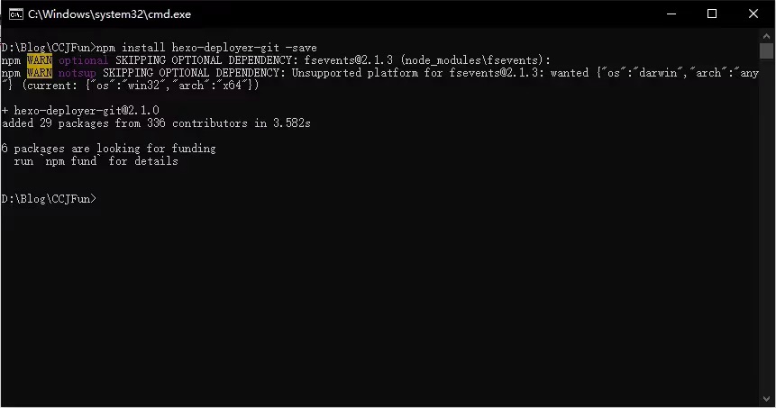 ⑧在博客文件夹根目录打开终端,执行npm install hexo-deployer-git --save