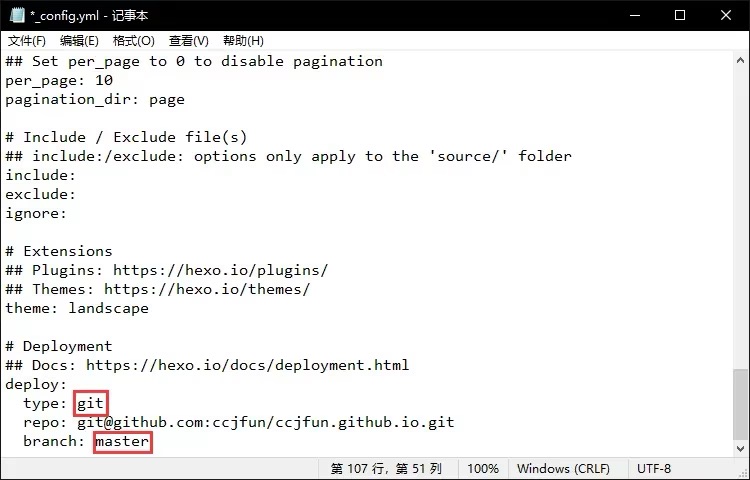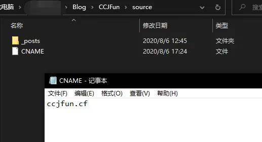 ⑦打开博客的source文件夹,创建一个CNAME文件(不带后缀),输入你的域名。同时修改_config.yml,保存后部署博客。