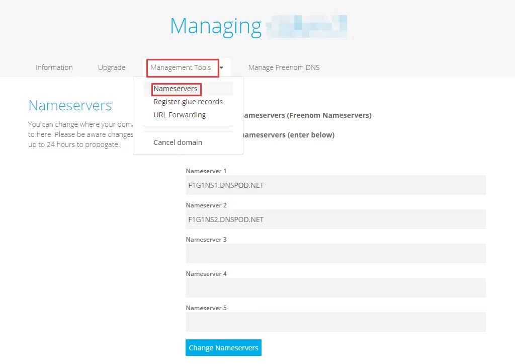 ④点击Manage Domain,进入Management Tools-Nameservers页面,按下图填写后保存。