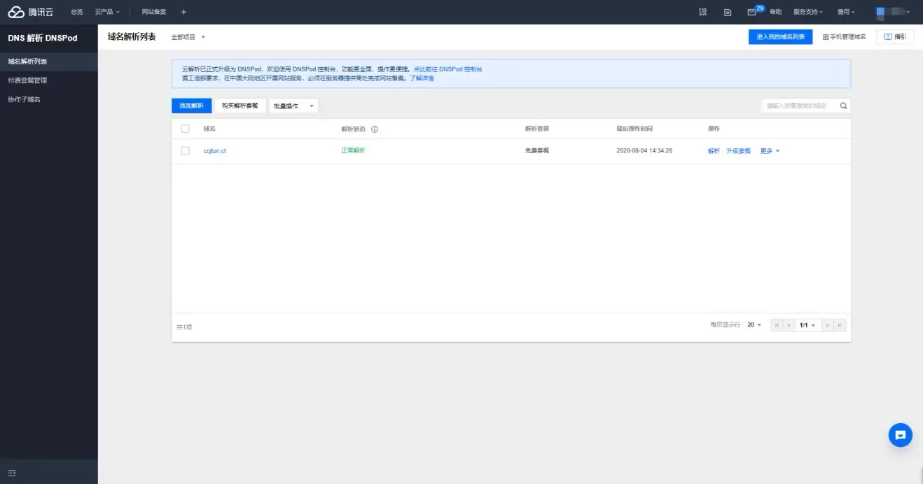 https://console.cloud.tencent.com/cns ),添加你刚刚注册的域名。