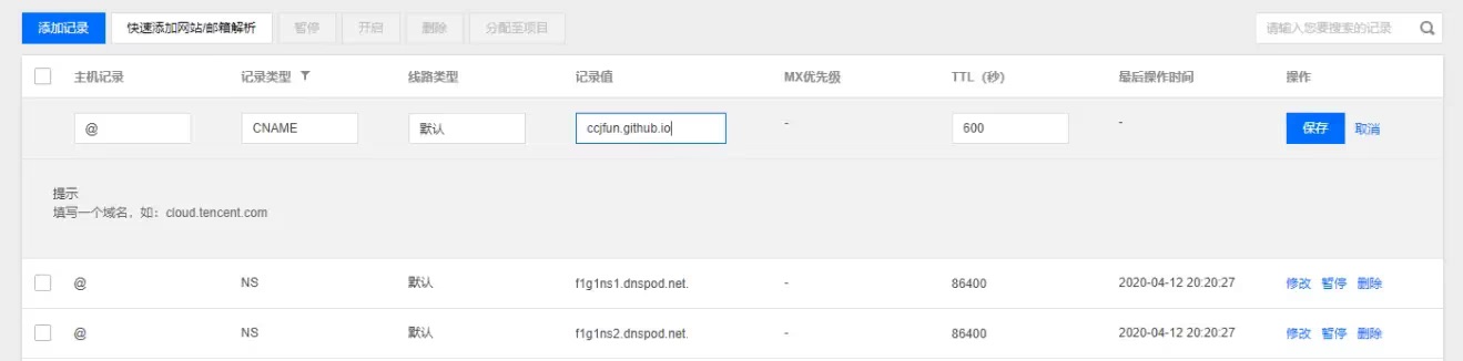 ⑥按下图添加解析记录,注意把记录值换成你自己的GitHub地址。假设你注册的域名是abc.tk,这样你的网站将可以从abc.tk访问。