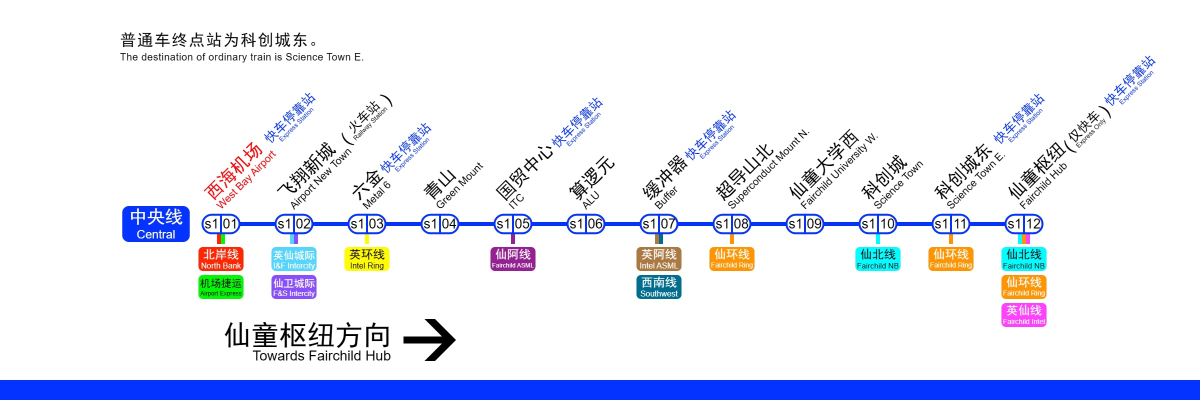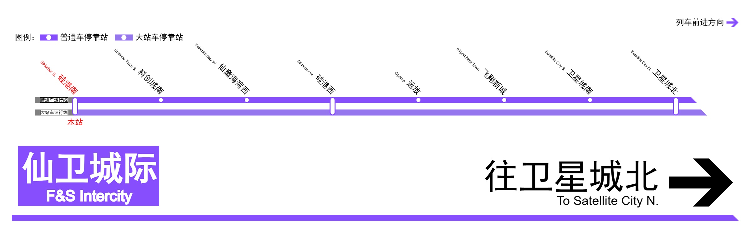 s为地铁,1-4普通车由硅港轨交-广州地铁合资公司运营,1X-4X快车由阿斯麦尔轻轨公司运营,5-9以及aW机场捷运均为全线普通车由硅港轨交-港铁MTR合资公司运营;r为高速城际,全程行驶在市内高速铁路,仅停靠特等站与机场站;t为普通城际,站站停或途经国铁普速铁路;火车由硅港轨交-上海金山铁路合资公司运营;